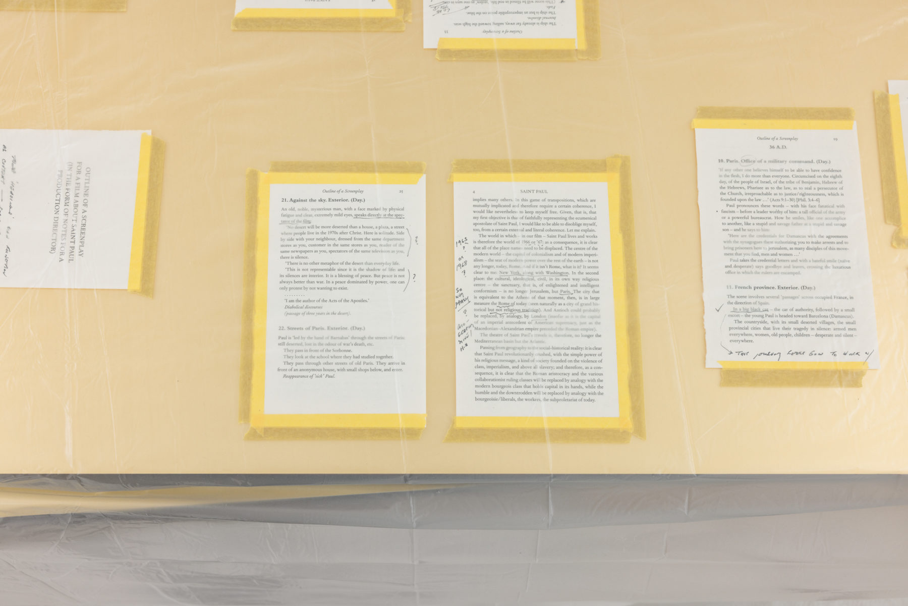 In Paul arbeitet Tom Burr mit Pier Paolo Pasolinis unverwirklichtem Film über das Leben des Apostels Paulus – ein 1966 verfasstes Drehbuch, das den Apostel nicht in Gewändern und Wüstensand, sondern im Trenchcoat und auf den Straßen der Stadt neu interpretiert, wie er durch die harten Geometrien von Paris, Rom, Genf und New York schreitet. Pasolinis Paulus ist ein Mann, der durch das Licht, die Offenbarung und die unerträgliche Last, zu viel und zu klar zu sehen, zerrissen wird. Burr greift diese Figur auf – nicht als Heiligen, sondern als Bruchlinie zwischen Unruhe und Sehnsucht, als Sehen, das sich gegen sich selbst wendet. Er deutet die berüchtigte Erblindung des Paulus auf dem Weg nach Damaskus um: nicht als göttliche Offenbarung, sondern als gewaltsames Losreißen – von Gewissheit, von staatlich sanktioniertem Glauben, von den geraden Linien der Macht. In Anlehnung an den unvollendeten Zustand des Films begreift Paul die Unvollständigkeit als schöpferische Methode, um überlieferte Fragmente und ungelöste Ideen in Bewegung zu setzen. Die Ausstellung bewohnt das Unvollendete: eine Form, die andere Formen einübt und in nachfolgende Iterationen, Anordnungen und Kontexte übertragen wird. Während der Entstehungsphase wird Burr gemeinsam mit dem Kurator der Ausstellung, Tom Engels, eine Publikation entwickeln, die die Ausstellung über ihre derzeitige Form hinaus erweitert und ihre nächsten Leben vorbereitet – weitere Mutationen von Paul, die sich mit jeder neuen Inszenierung verwandeln werden. In diesem Entfalten wird Paul zu einem zerbrochenen Spiegel, einem anhaltenden Ungehorsam, in dem das Niedergeschlagenwerden zugleich ein Neubeginn ist.